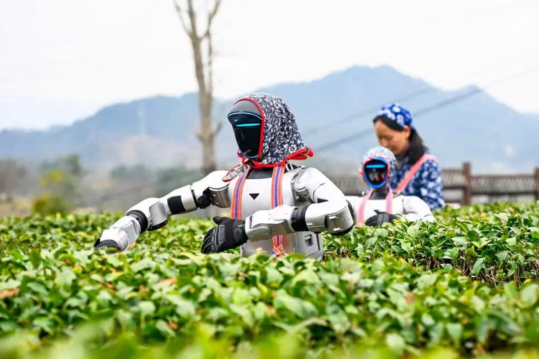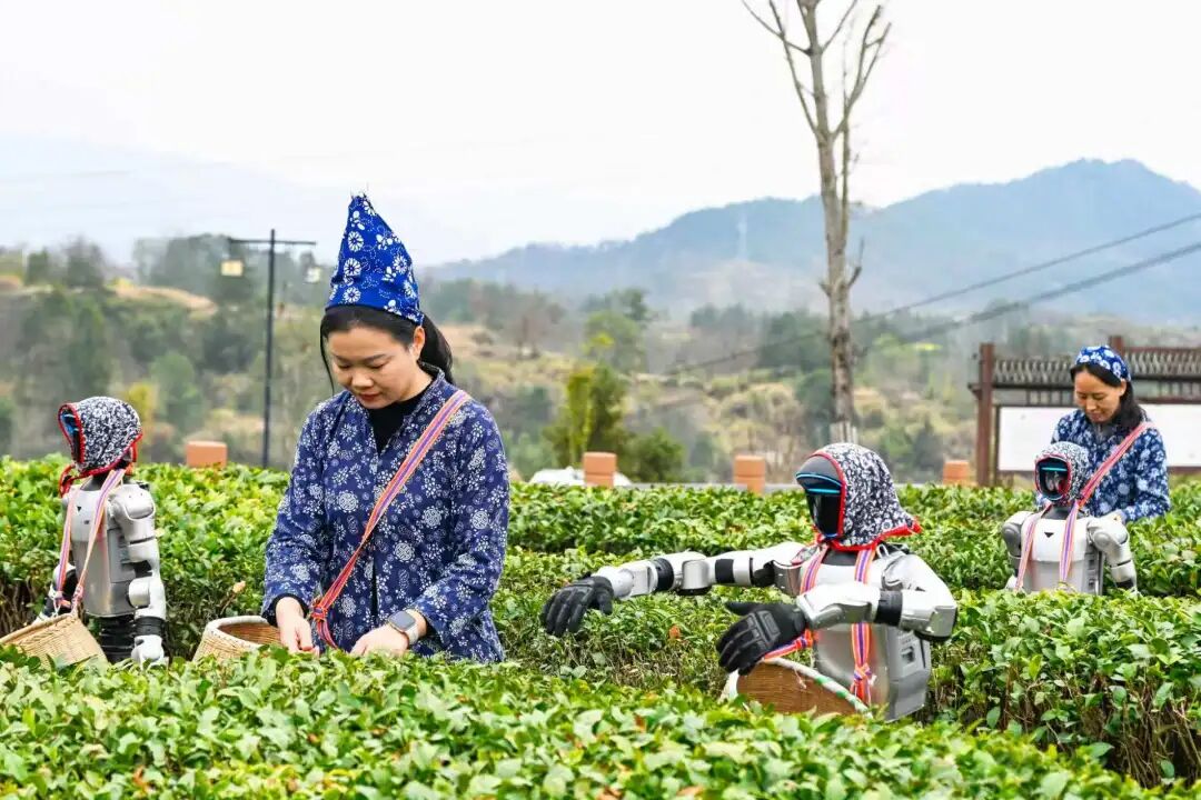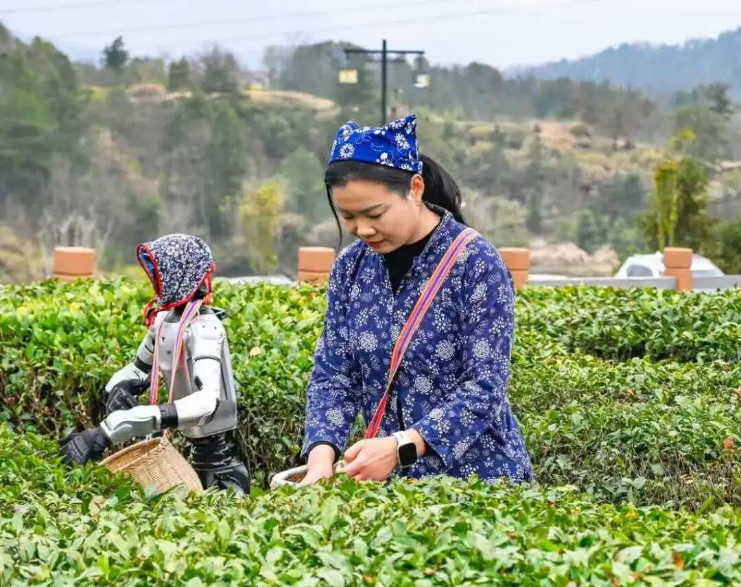 近日,在湖北省黄冈市英山县乌云山村茶园里,智能机器人与茶农一同进田采摘春茶,以科技手段助力春耕生产,为传统茶产业注入新动能。中新社供图