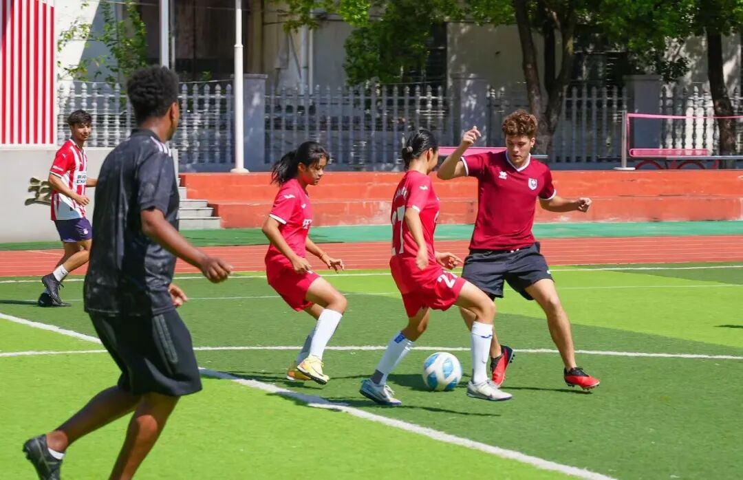 ▲伍家岗小学李家湖校区女子足球队与中欧创投西班牙商会的西班牙教练进行互动。