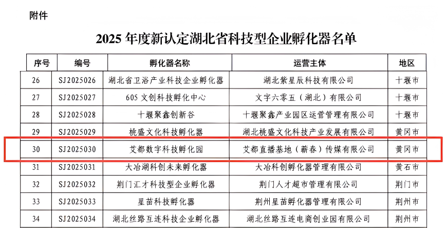 近日,省科技厅发布2025年度新认定湖北省科技型企业孵化器名单,蕲春县艾都数字科技孵化园入选。