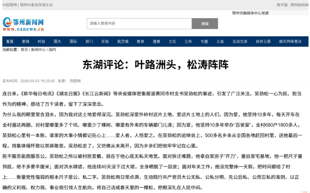 连日来,《新华每日电讯》《湖北日报》《长江云新闻》等央省媒体密集报道黄冈市村支书吴劲松的事迹,引发了广泛关注。吴劲松一心为民、担当作为的精神,感动了万千读者,留下了深深思念。
