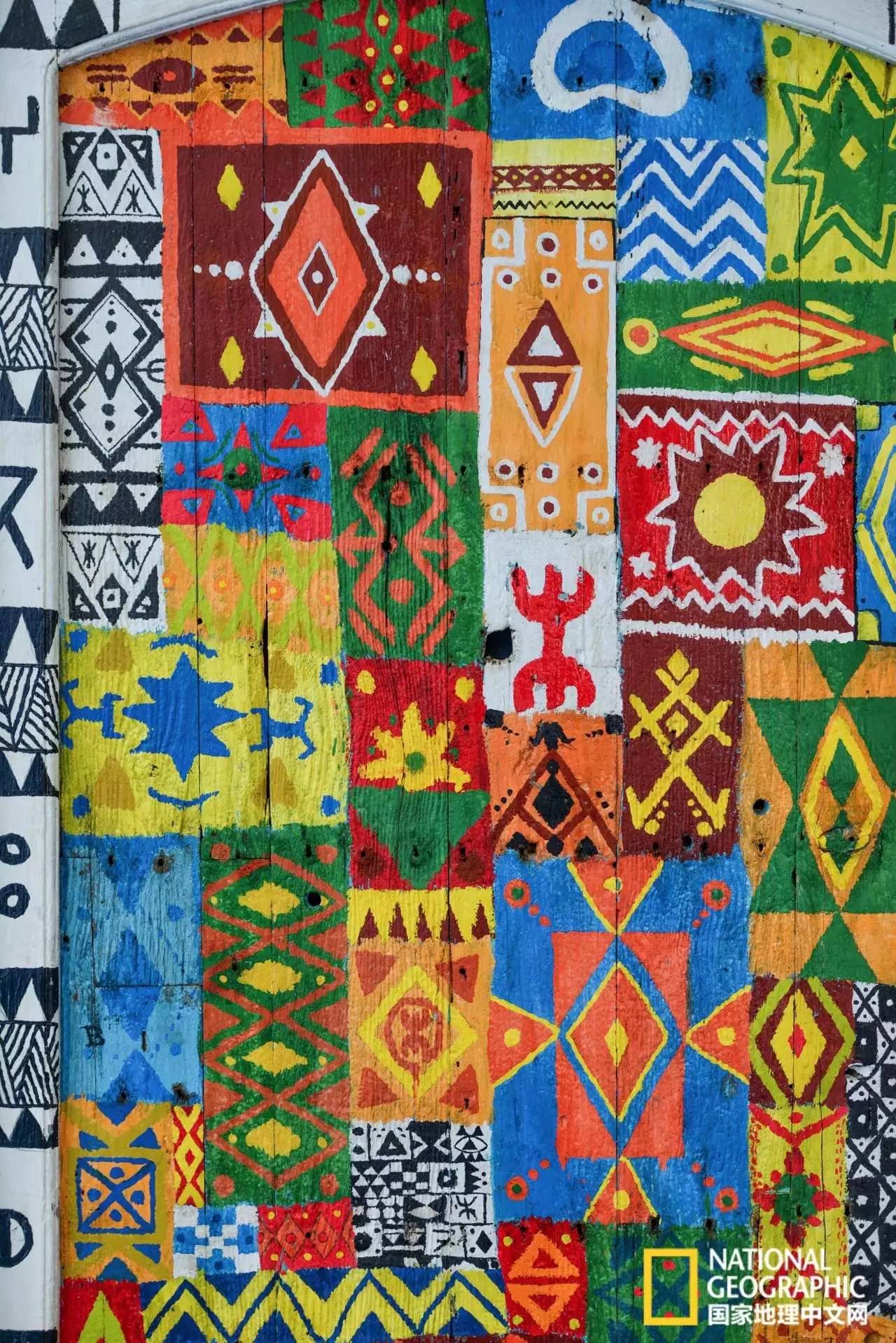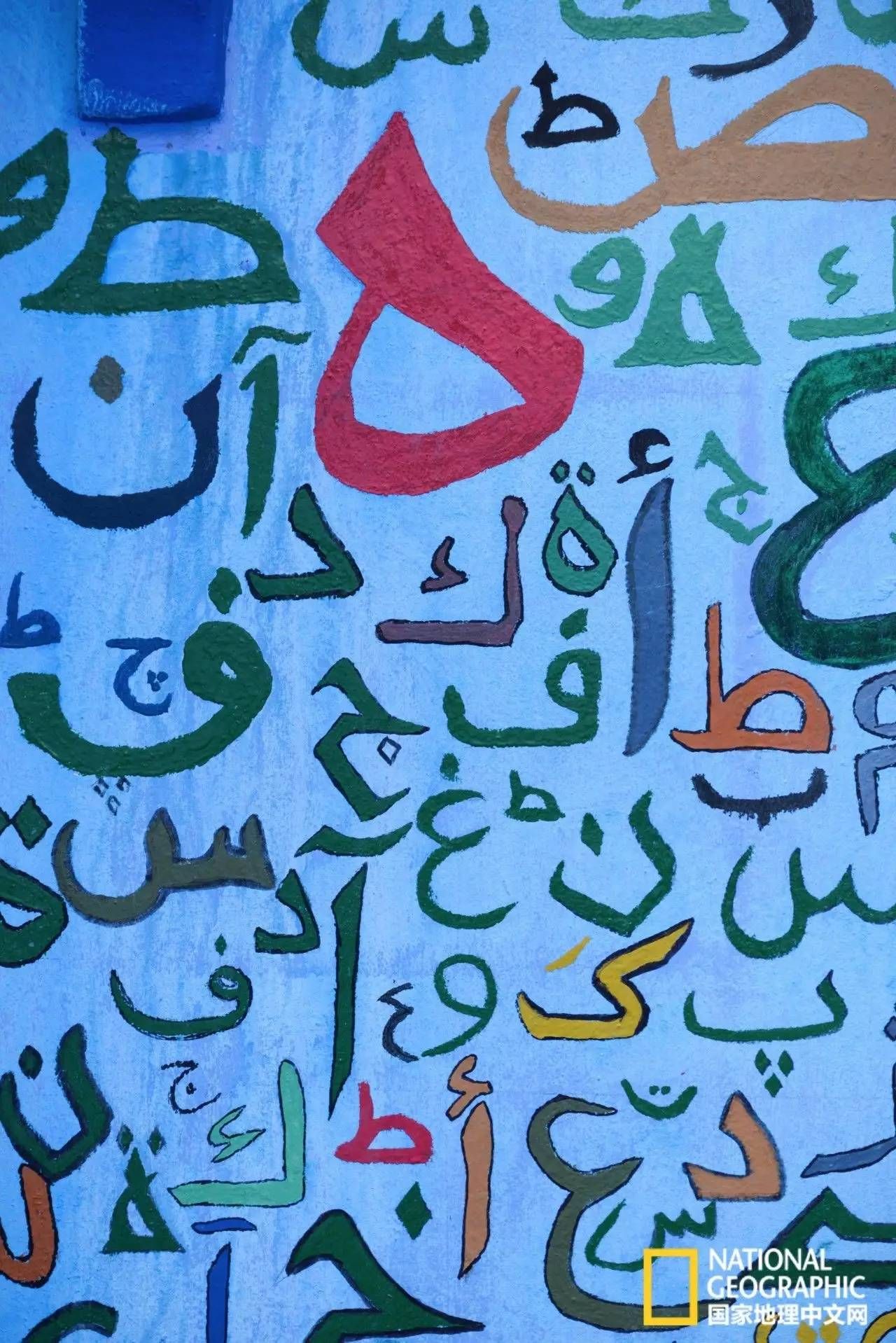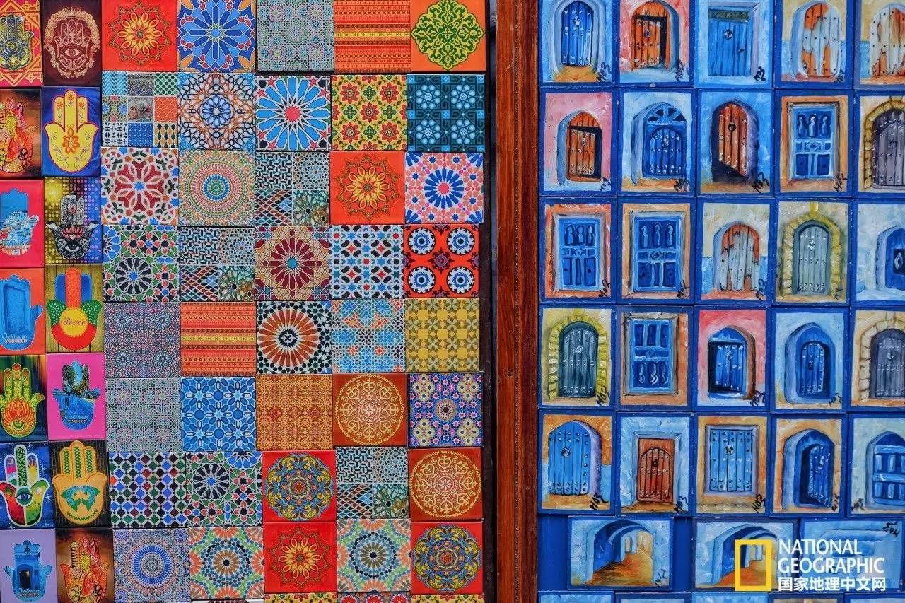 这不,在某个小巷转角就偶遇到这“蓝色海洋”中的色彩缤纷,这些不是艺术品堪比艺术品的装饰,其实是一户人家的木门和墙壁,奇特的文字和花纹,由各种色彩组合而成,远看像一块摩洛哥花式地毯,比起毕加索和康定斯基等抽象画家的画作,这更多了一些生活味儿,我想如果这些画家能穿越至此,一定也会被这些图案打动。