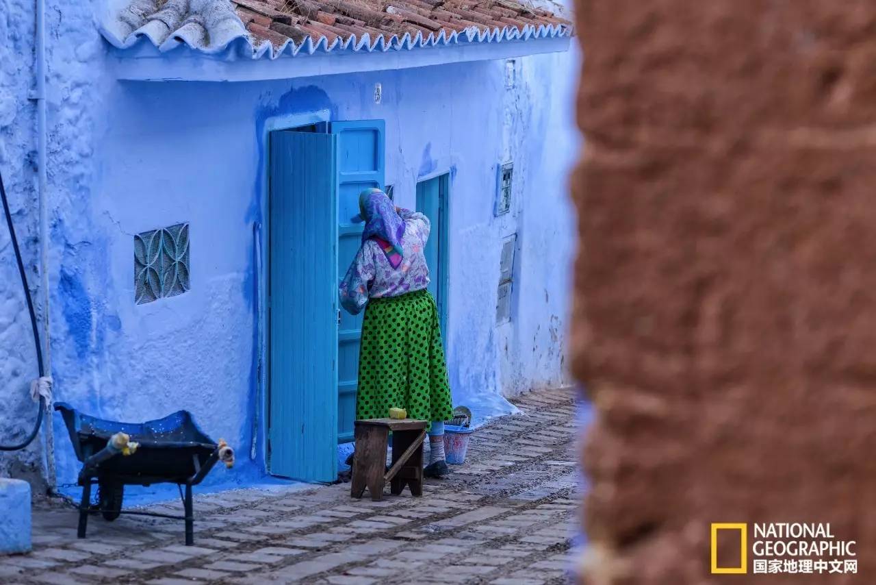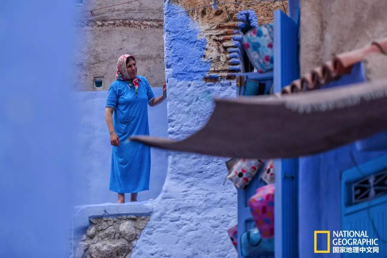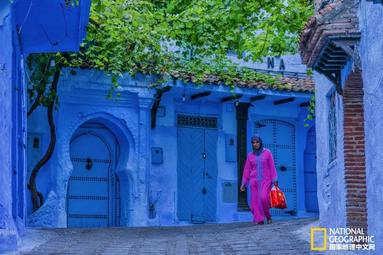 身着桃红色长袍的妇女,行走在蓝色的小巷中,显得格外耀眼。
