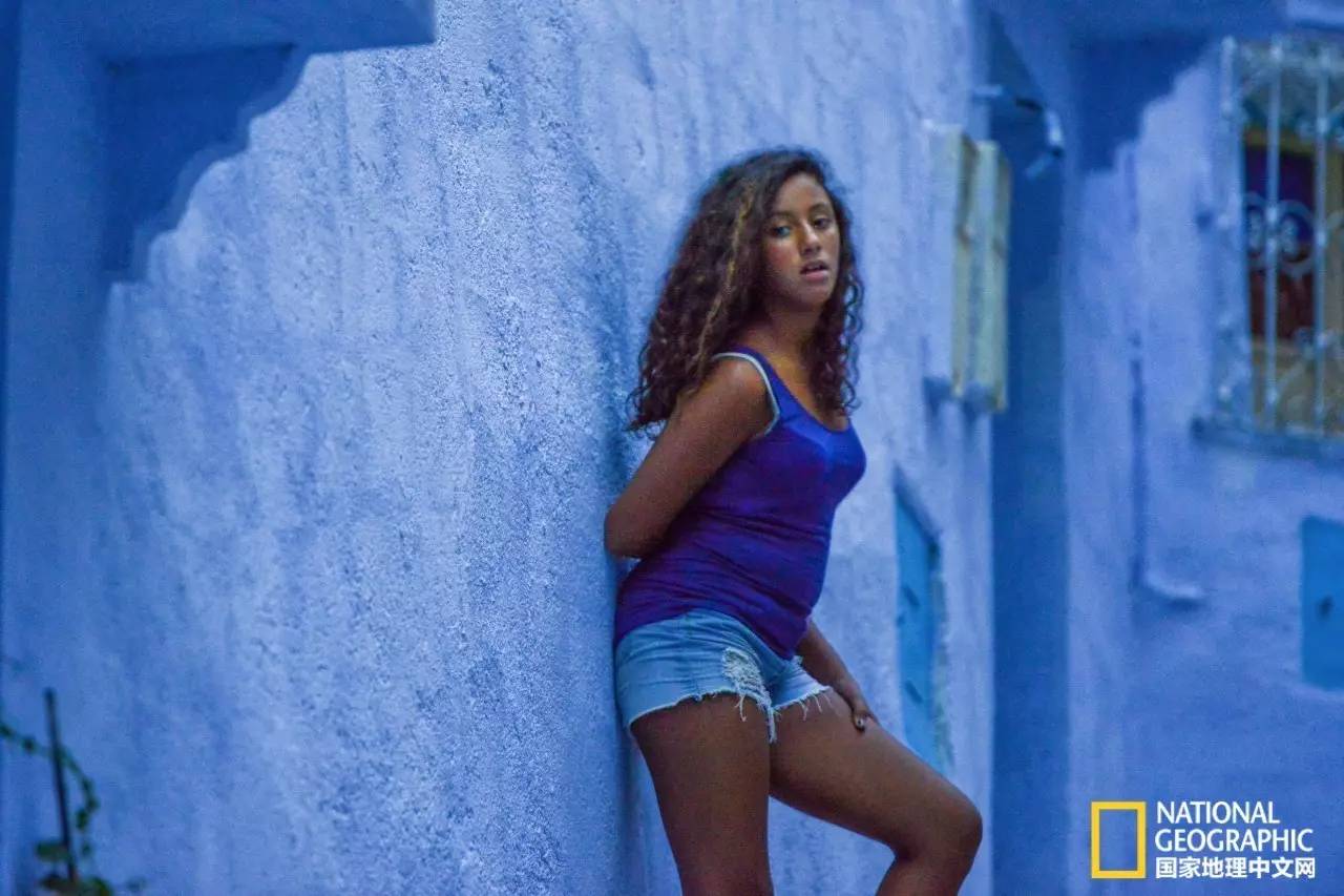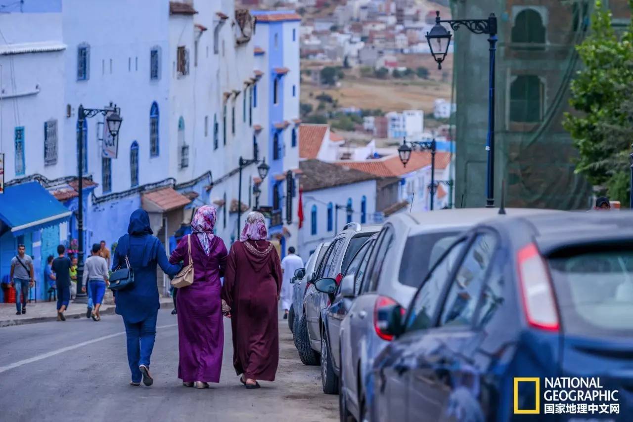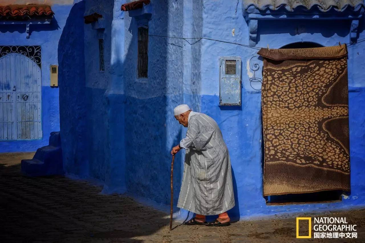 身着桃红色长袍的妇女,行走在蓝色的小巷中,显得格外耀眼。