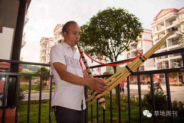 贵州省惠水县明田安置小区,梁王地正吹奏芦笙。(9月12日摄)新华社记者 刘续 摄