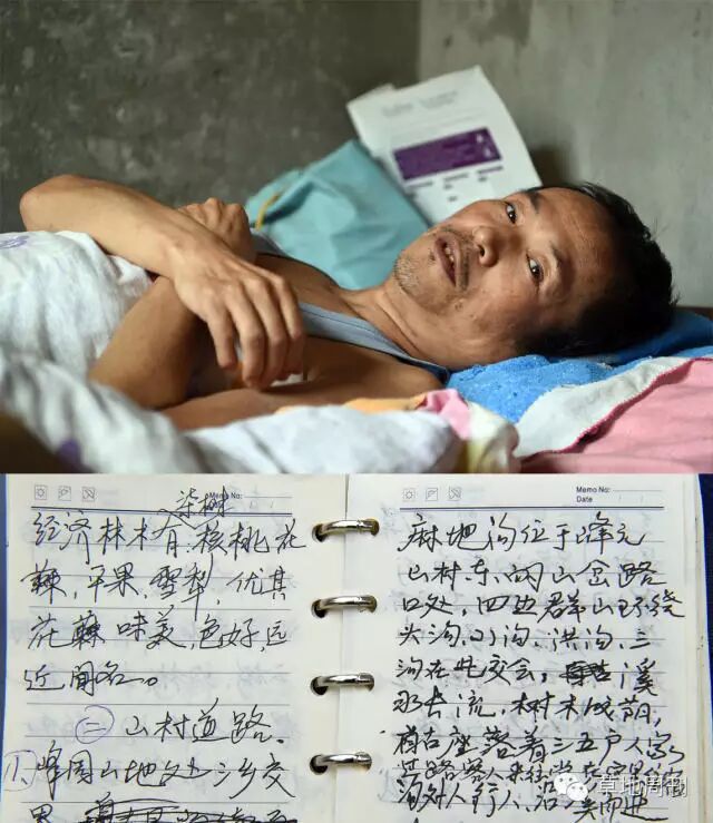 甘肃省陇南市文县尚德镇丰元山村,瘫痪在床的张代全和他写的村史。(9月4日摄)新华社记者 范培珅 摄