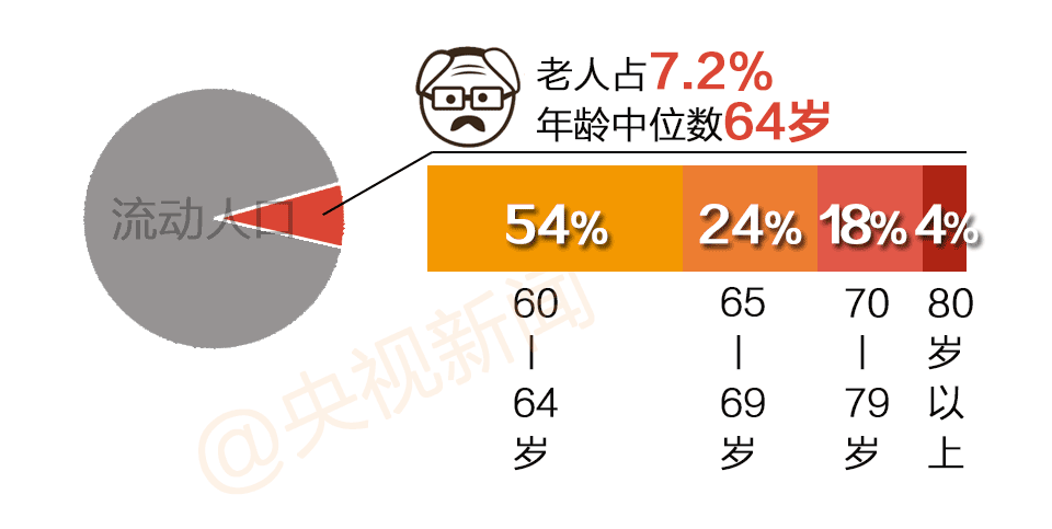 2015年国家卫生计生委流动老人健康服务专题调查显示,流动老人占流动人口总量的7.2%,年龄中位数为64岁。