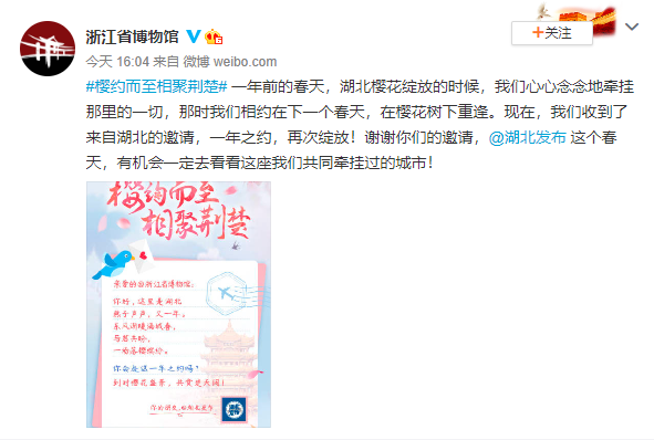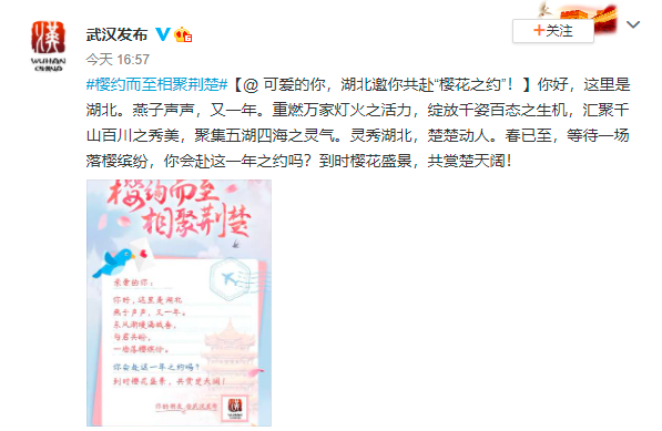 随后,武汉、襄阳、宜昌、荆州等17个地市州官方微博也陆续发布邀约海报。