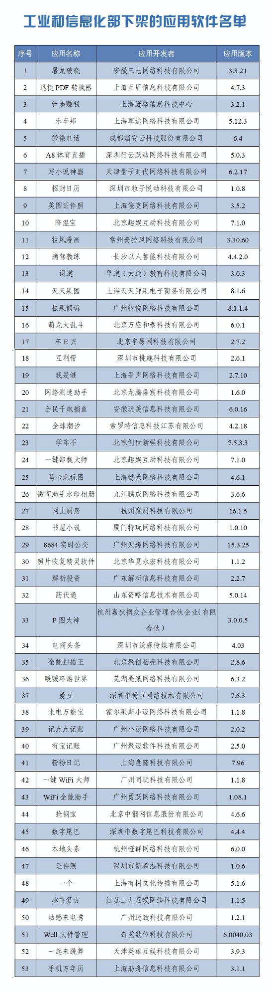 滑动查看↓2021年3月11日,工信部向社会通报136家存在侵害用户权益行为App企业的名单。截至目前,经第三方检测机构核查复检,尚有53款App未按照要求完成整改。