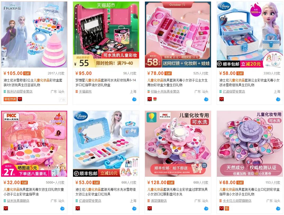电商网站截图。 其包装大多绚丽可爱,在商品介绍页面会标称“健康”、“无毒”、“水溶配方”、“天然成分”、“温和不刺激”、“不含防腐剂”等,有些还会注明食品级环保儿童彩妆。 价格少则十几元,多则几百元。销量方面亦十分可观,不少产品月销量达1000+,其中,一款27元的彩妆套盒有5000多人付款,商品页面显示热卖10万件以上。 家长们因为商品健康、安全的宣传和相对低廉的价格,为孩子购置了化妆套盒,但这些产品真的安全吗? 在儿童彩妆的买家评价区,“味道太冲了,不知道是什么做的”“用了一脸的荧光粉,洗都洗不掉”“我家孩子用完有点过敏”“油油腻腻,孩子太小不建议买,简直是灾难”等评价屡屡出现。 虽然儿童护肤领域,有一些知名品牌,但这些品牌极少涉及到彩妆领域,因此市场上售卖的儿童彩妆套盒很多并非出自大品牌,多为小工厂生产。 记者注意到,电商平台上儿童彩妆套盒销量靠前的店铺里,不少显示是玩具旗舰店。一些店铺提供了检测报告、3C证书,以及彩妆检验报告,还有一些声称符合《化妆品卫生规范》要求,但也有部分店铺只是说菌落总数符合卫生规格,没有提供其他质检证明。 即使是店家晒出检测报告等,但若仔细辨认,会发现部分商家送检的样品名称是装扮玩具,并非化妆品,或者在送检、备案时只是显示为化妆品,并未加上“儿童”等字眼。