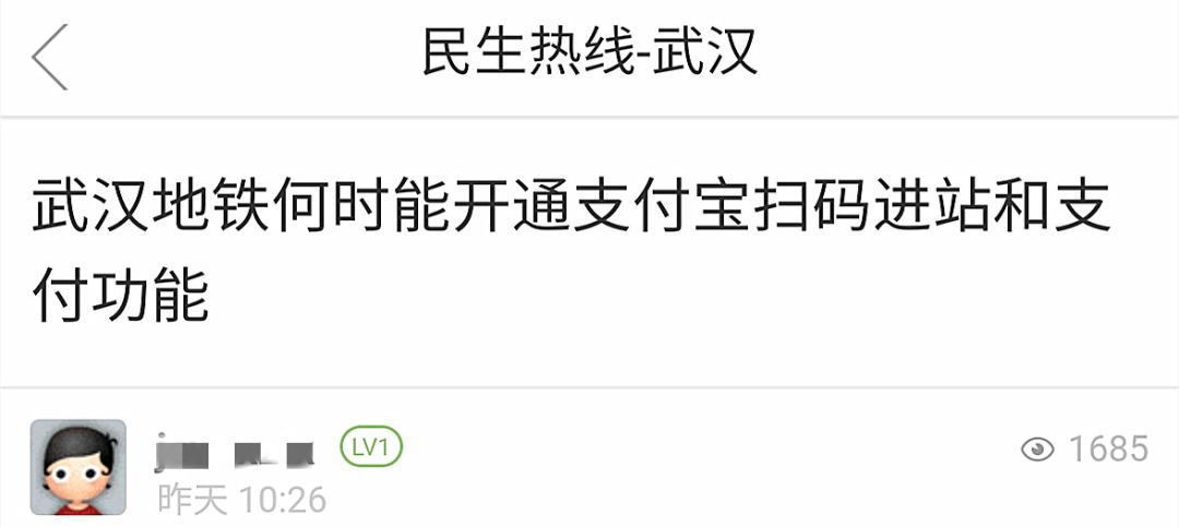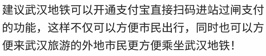 4月7日上午,武昌首义学院学生郑恒在荆楚网《民生热线》留言称,建议武汉地铁开通支付宝直接扫码进站过闸支付功能,这样不仅可以方便市民出行,同时也可以方便来武汉旅游的外地市民更方便乘坐武汉地铁!(点击查看贴文>>)