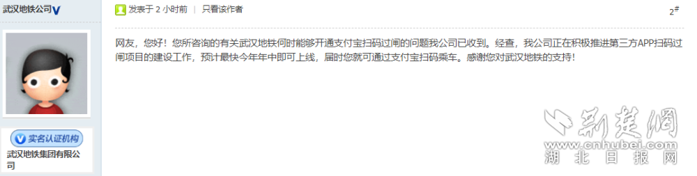 当日下午,网友留言4小时后,武汉地铁集团有限公司即在《民生热线》平台上给出了官方回复。该公司相关负责人介绍,他们已经向杭州、南京等实现了第三方APP扫码过闸的城市学习取经,武汉地铁年内可实现支付宝、微信、云闪付APP扫码过闸功能,最快年中即可上线。