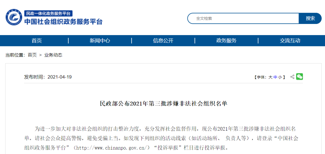如发现上述组织的活动线索(如活动场所、 负责人等)请登录中国社会组织政务服务平台网站“投诉举报”栏目进行投诉举报