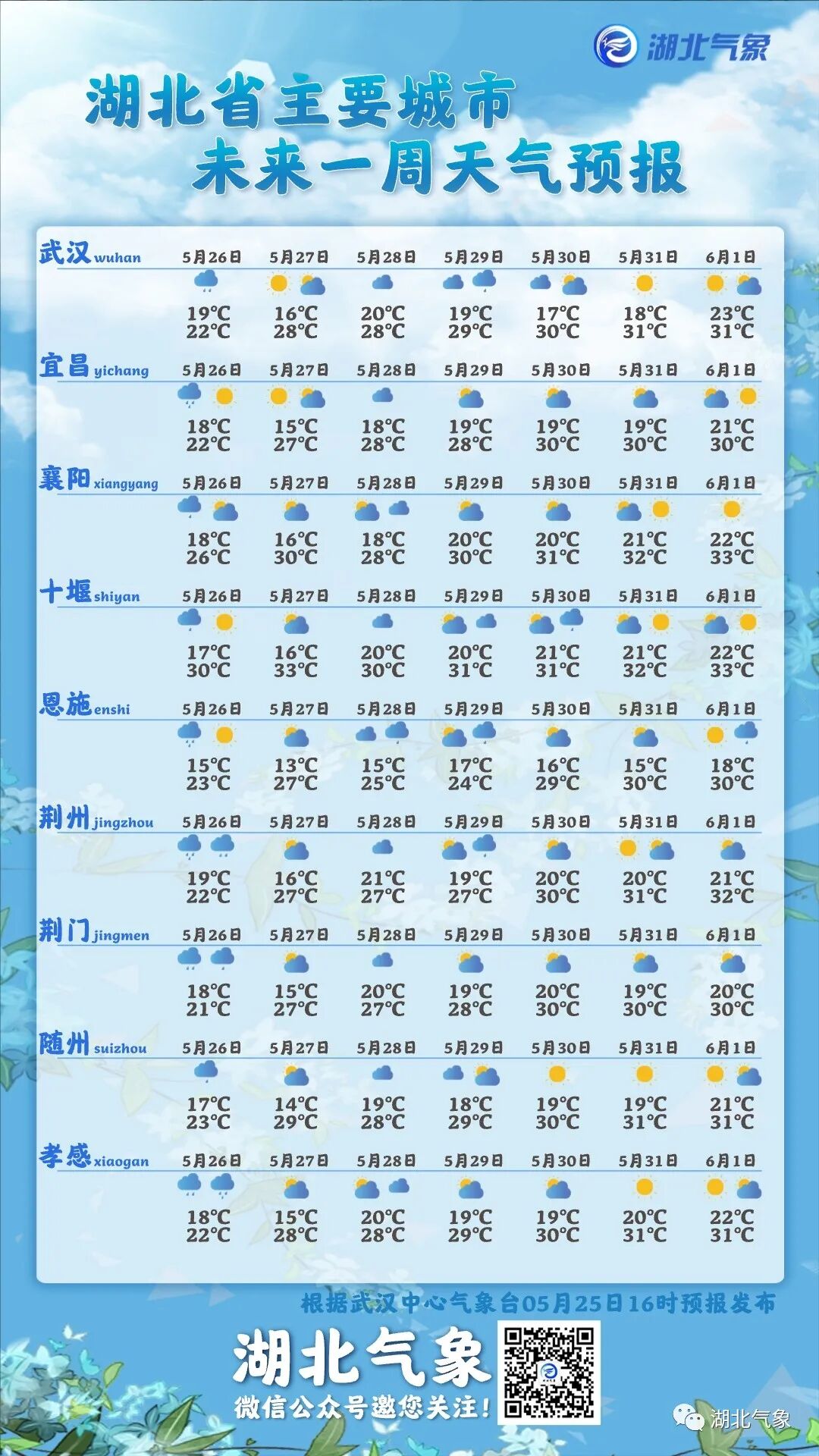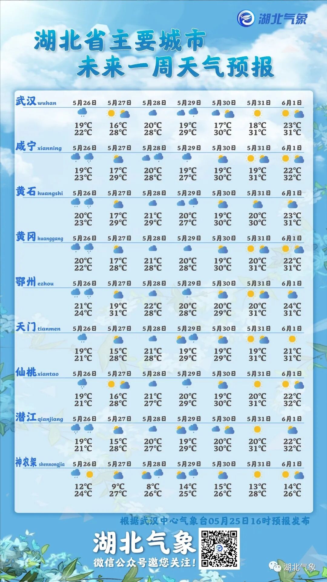 整个过程降雨量30-50毫米,局部70毫米以上,最大小时雨强20-40毫米(1小时降雨量相当于一天大雨雨量),强降水时段主要集中在26日5时至14时,蔡甸、经济技术开发区、江夏中南部出现暴雨的可能性较大。气温波动不大,为19℃-24℃。