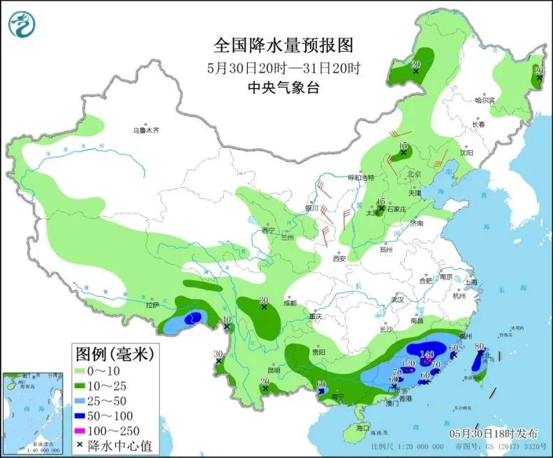 中央气象台预计,至31日20时,内蒙古东北部、西藏东部、江南南部、华南大部、四川南部、云南西部和南部、台湾岛等地部分地区有中到大雨,部分地区有暴雨或大暴雨。
