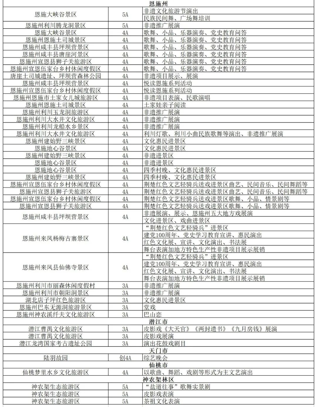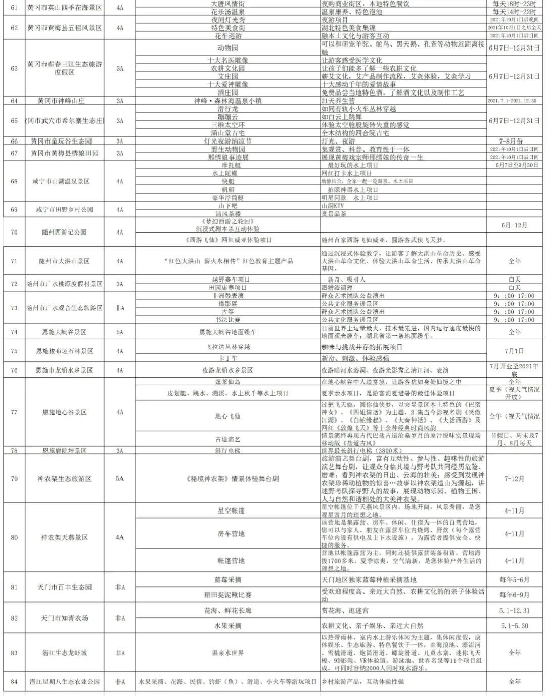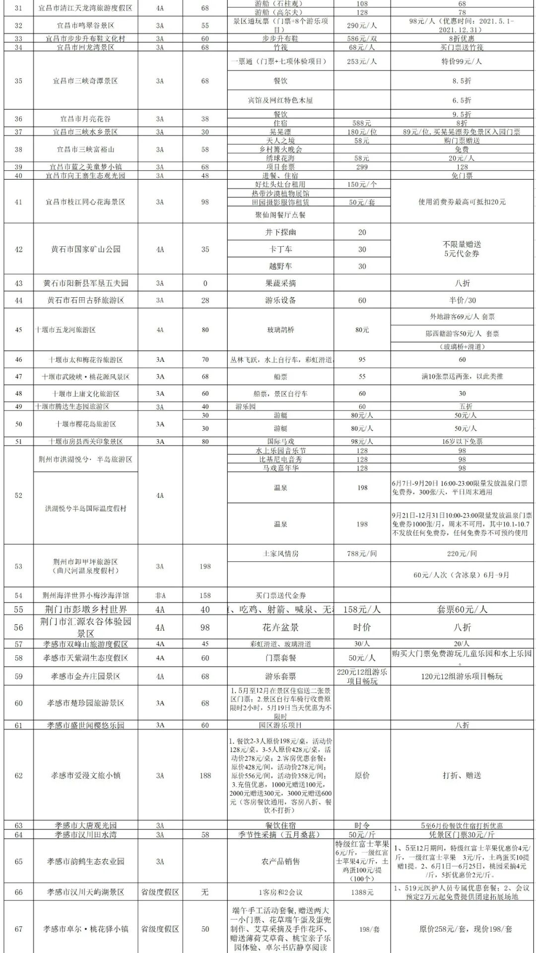 活动仪式上,湖北省文化和旅游厅发布了一批景区推出惠民让利的优惠措施:236家A级旅游景区推出各种惠民让利的优惠措施,18家景区门票免费;武汉黄陂木兰文化旅游区、襄阳古隆中景区、宜昌长阳清江画廊旅游度假区、恩施巴东神农溪纤夫文化旅游区、恩施利川腾龙洞景区等5A景区和18家热门4A景区每月提供免费门票1000张;49家景区实行门票5折优惠;63家景区推出门票6折至9折等不同幅度的优惠;111家景区同时推出景区内二次消费优惠或优惠套餐;湖北省龙头旅游企业鄂旅投集团将定时定量在“游湖北”平台上供给旗下23家景区的免费门票和特价门票;宜昌百里荒高山草原旅游区向武汉市民赠送100万张免费门票。