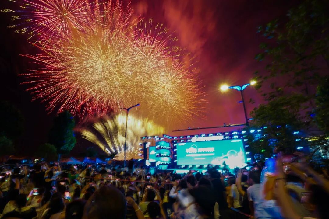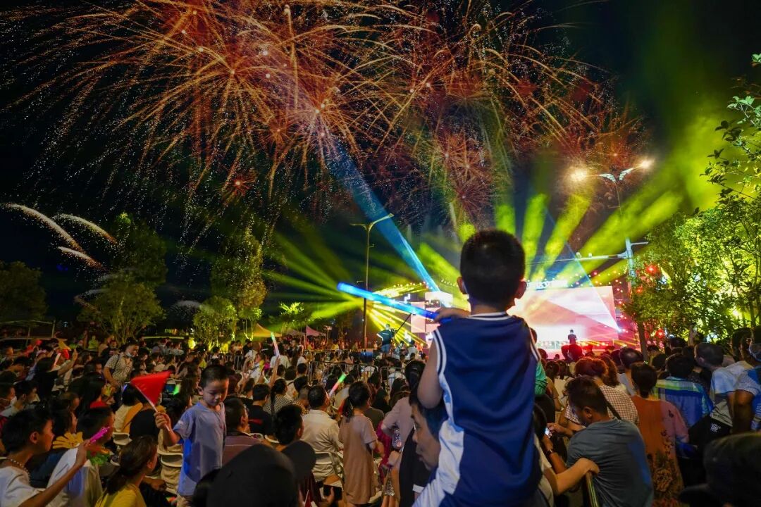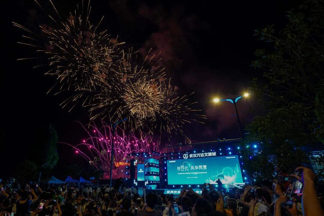 当晚的焰火盛典创造性地将漫天花火与现场音乐会相结合,现场数千名观众在乐队的带领下尽享浪漫夏夜。压轴出场的盛大焰火更是将晚会气氛推向高潮,为武汉人民精心呈现一场形式新颖的视听盛宴。阖家出行尽享浪漫时刻