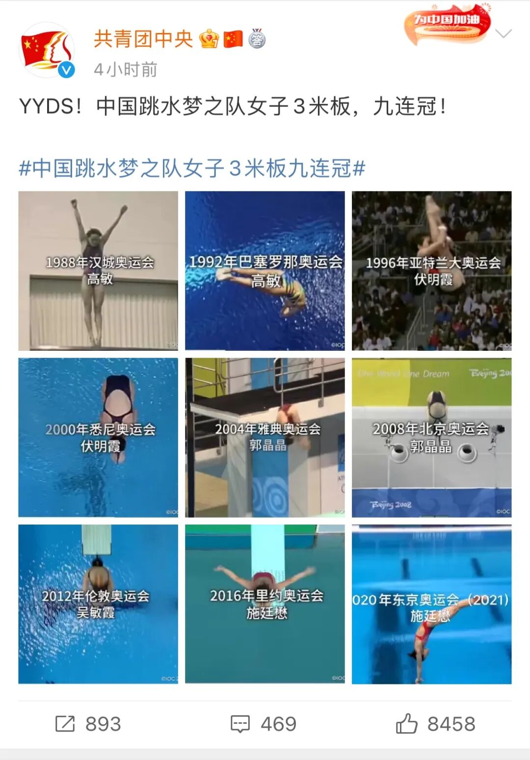 8月1日下午在东京奥运会跳水女子3米板决赛中中国选手施廷懋以383.50分蝉联冠军实现了中国跳水在这个项目上自1988年以来奥运九连冠