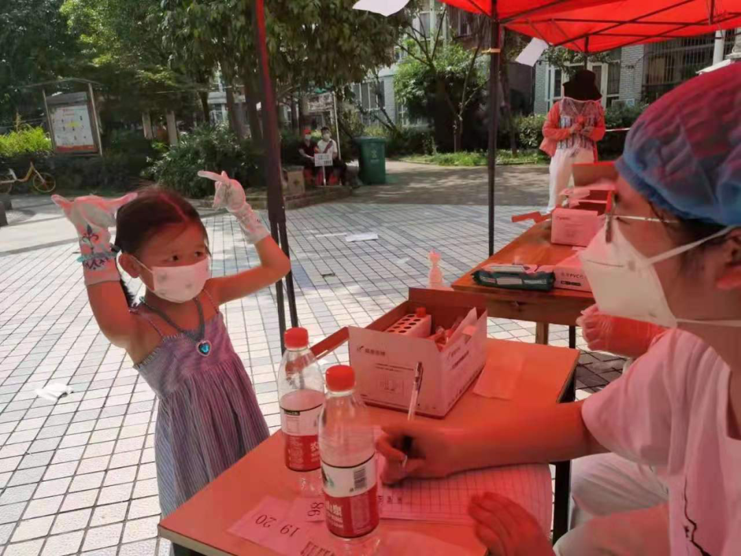 小女孩做完采样后,向医务人员做出了“666”的手势。