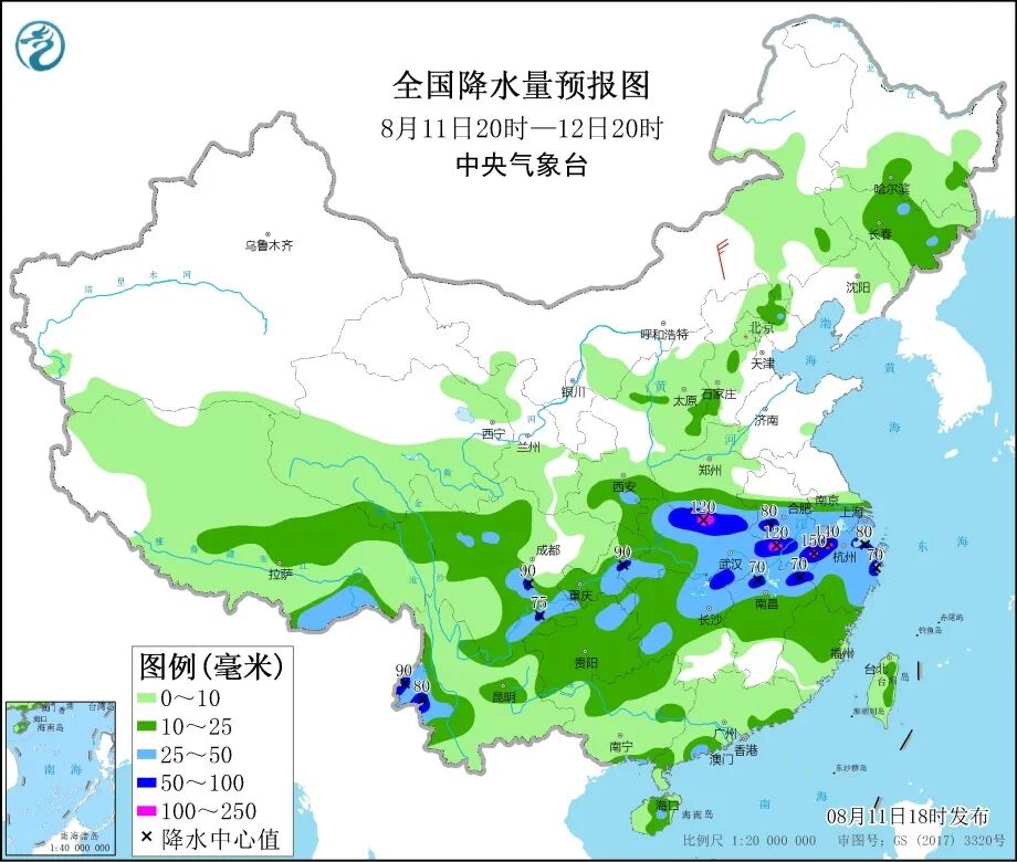 中央气象台11日18时继续发布暴雨蓝色预警,预计11日20时至12日20时,河南、湖北、安徽、江苏、上海、江西、浙江、湖南、重庆、贵州、云南等地部分地区有大到暴雨。