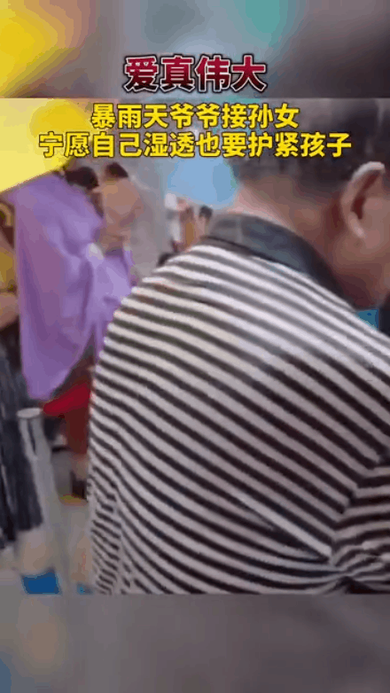 爷爷就把它披在小小的孙女身上自己就淋着雨一路小心翼翼地护送孙女把她抱上电动车