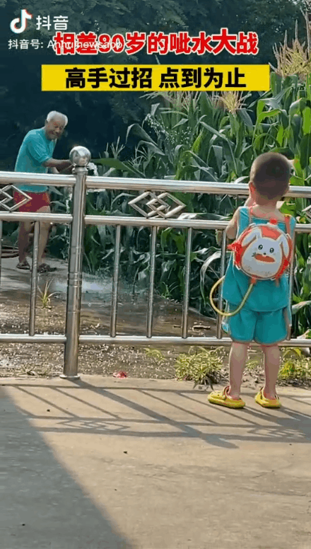 爷爷不甘示弱直接拿起水管回击小孙子见爷爷回击立马加强了火力场上战况胶着
