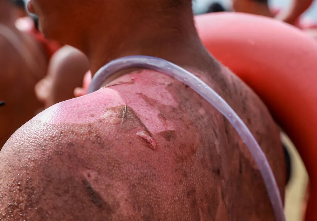 胸部到脖子之间的皮肤全被晒破,老皮脱掉后又磨破了新皮,每一处破皮的地方都露出鲜红的真皮组织,叫人不敢触碰,生怕一碰就会流血。