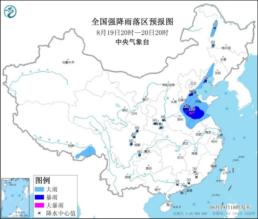 中央气象台19日18时继续发布暴雨蓝色预警:预计19日20时至20日20时,河北、天津、山东、河南、辽宁等地部分地区有大到暴雨。其中,山东西南部、河南东北部等地局地有大暴雨。