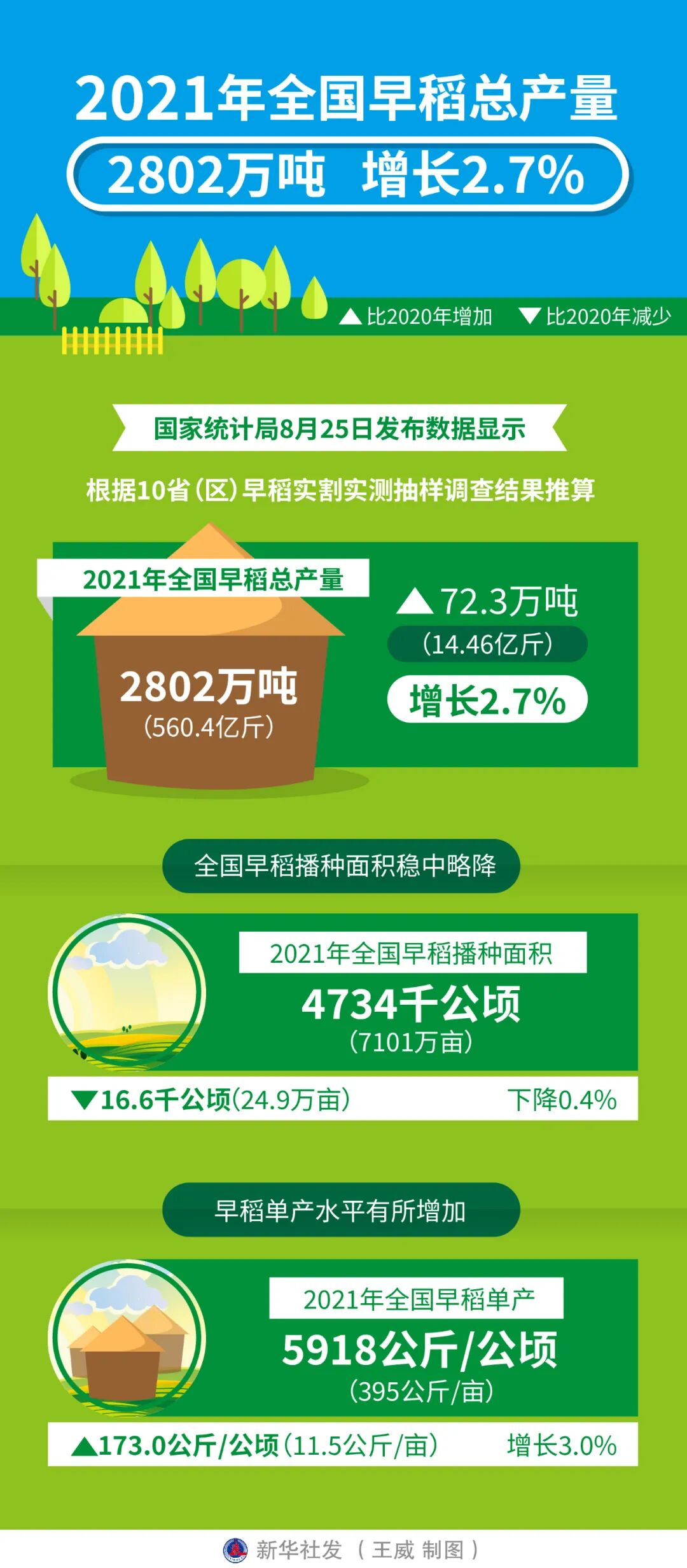 国家统计局发布数据,2021年全国早稻总产量2802万吨,比2020年增加72.3万吨。