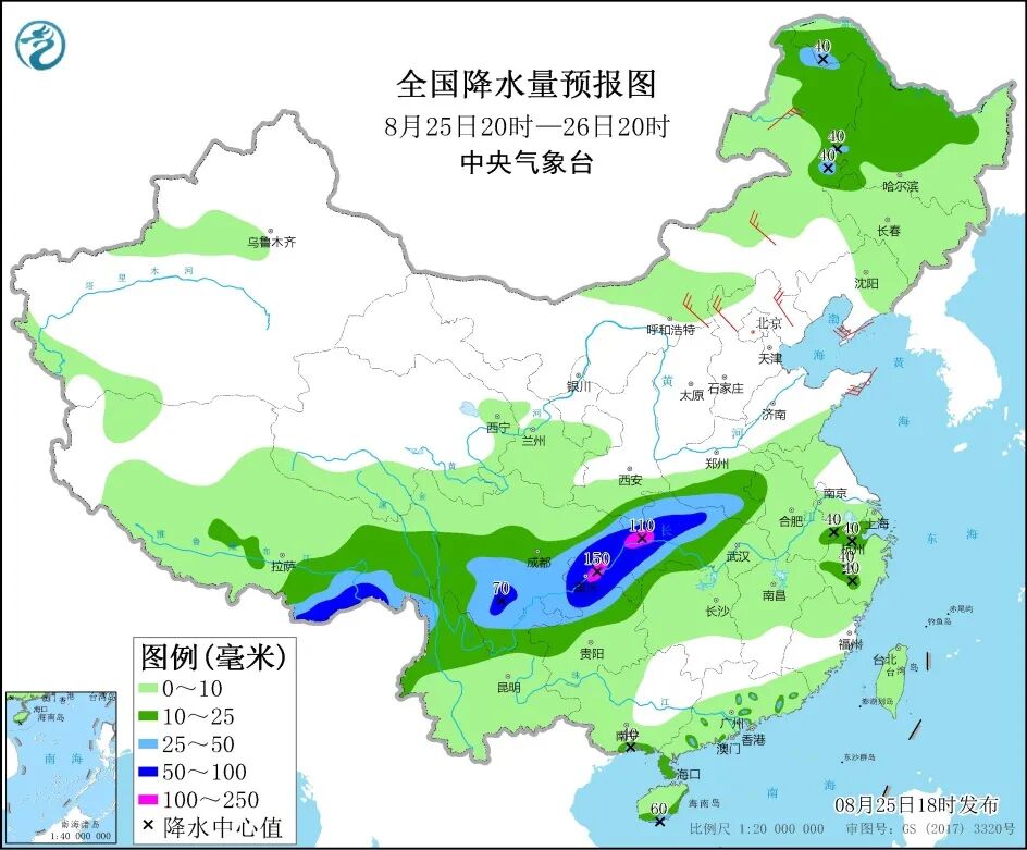 25日20时至26日20时,四川东部和南部、重庆、贵州北部、湖北西部和北部、陕西东南部、河南南部、云南东北部和西北部、西藏东南部、内蒙古东北部等地部分地区有大到暴雨,其中,重庆局地有大暴雨。