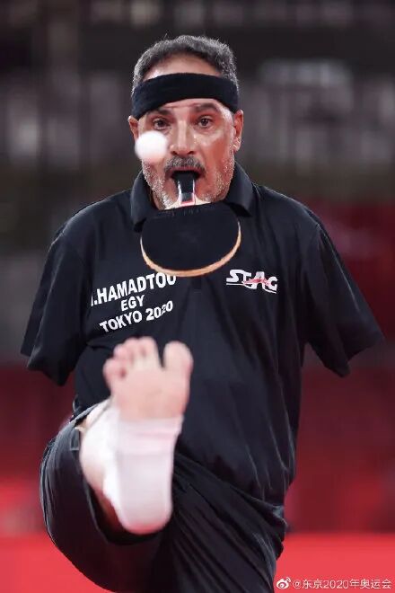 这名埃及残奥运动员叫易卜拉欣·哈马托10岁时一场火车事故让他失去了双臂但这并不影响他对乒乓球的热爱经过多年的练习他锻炼出了口衔球拍、用脚发球的打球能力