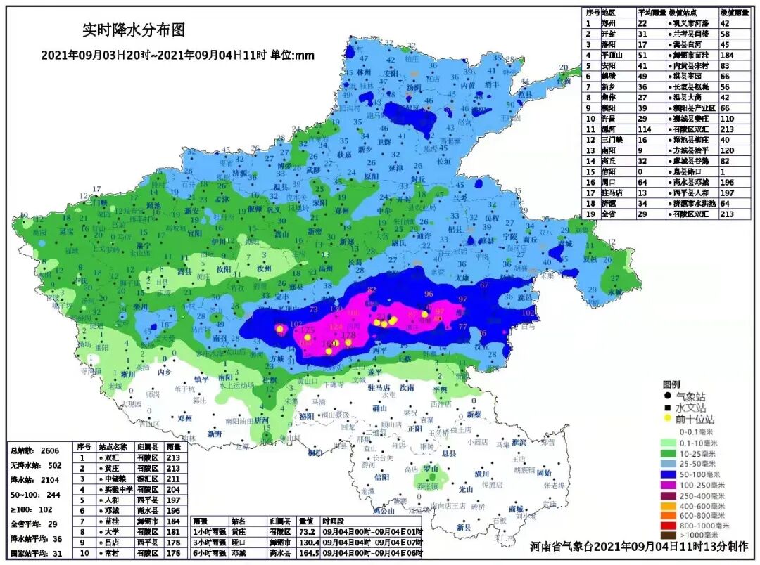 最大雨量为漯河市召陵区双汇和黄庄