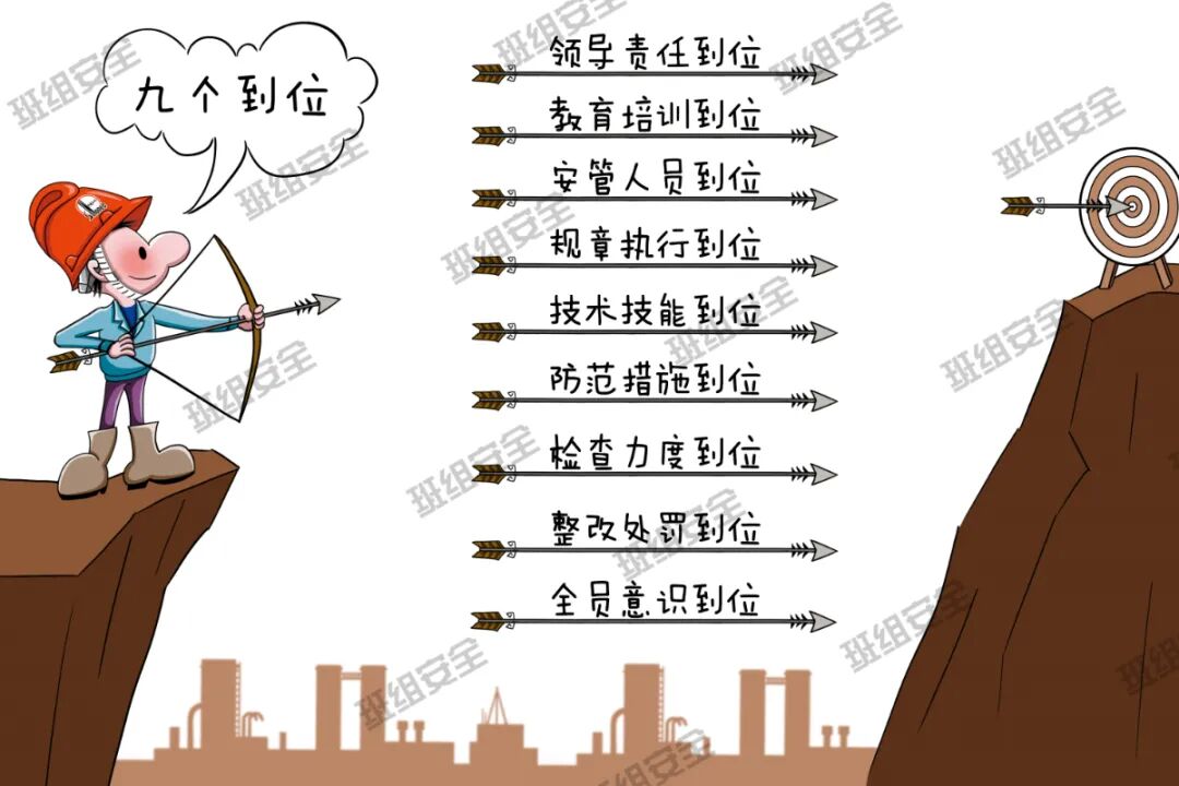 九个到位:领导责任到位;教育培训到位;安管人员到位;规章执行到位;技术技能到位;防范措施到位;检查力度到位;整改处罚到位;全员意识到位。