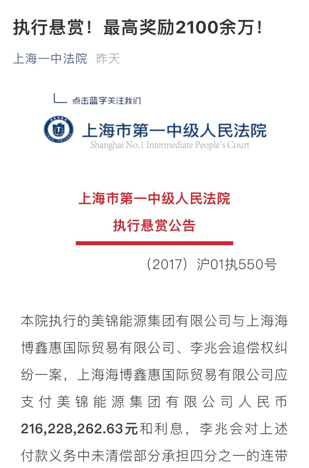 公告显示,美锦能源集团有限公司与上海海博鑫惠国际贸易有限公司、李兆会追偿权纠纷一案,上海海博鑫惠国际贸易有限公司应支付美锦能源集团有限公司人民币2.16余亿元和利息,李兆会对上述付款义务中未清偿部分承担四分之一的连带清偿责任。