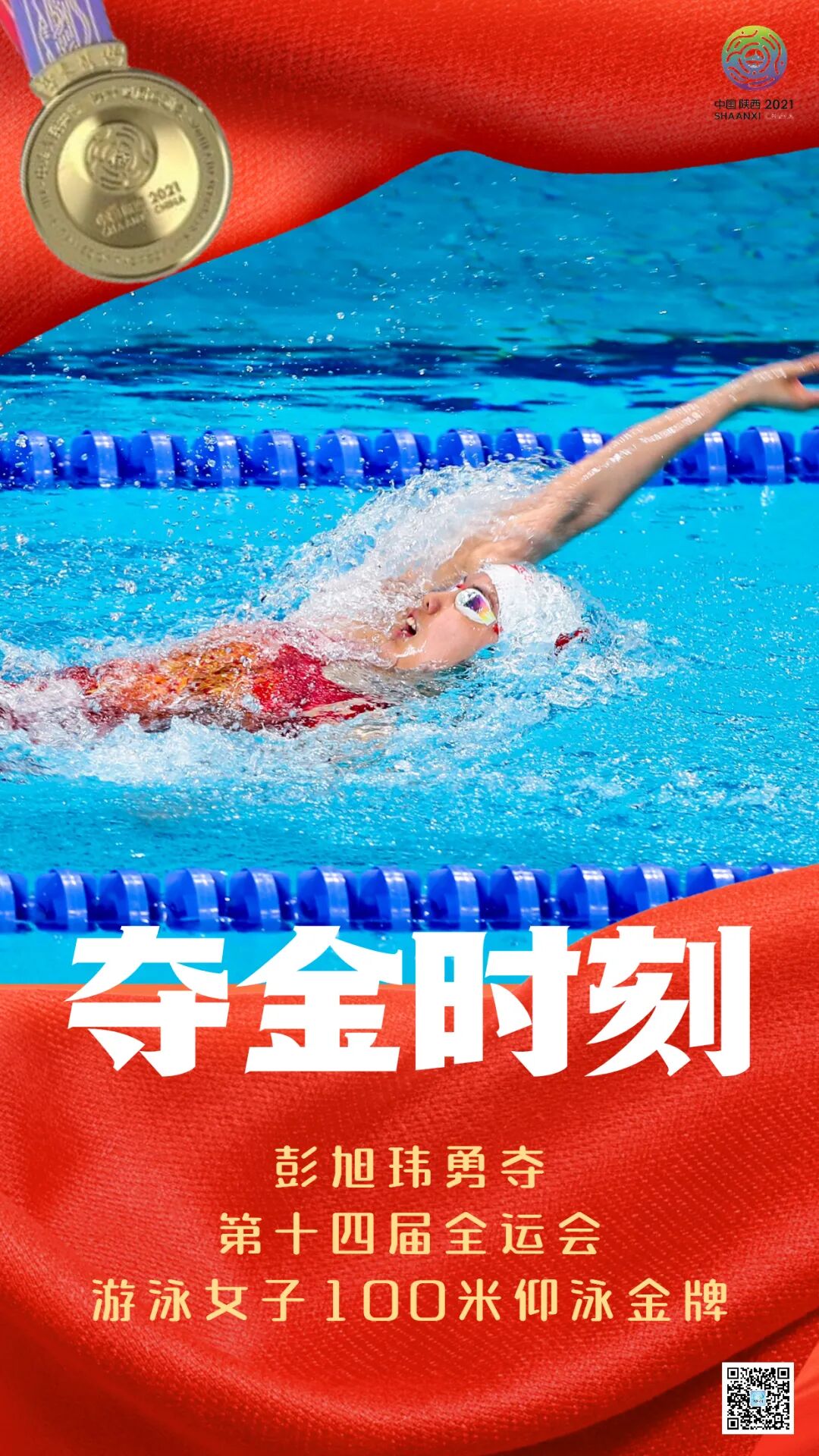 9月21日第十四届全运会游泳项目在西安奥体中心游泳跳水馆进行第三个比赛日争夺在女子100米仰泳决赛中18岁湖北小将、麻城姑娘彭旭玮在最后时刻强势逆转以59秒31率先触壁首度加冕全运会冠军