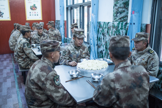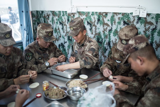 在“高原戍边模范营”3连,刚刚结束巡边任务的官兵,一起在连部食堂包起了饺子。比起吃月饼,这种聚在一起的方式更能缓解他们的思乡之情。3连的战士告诉记者,虽然自己很想家,但是和生死相托的战友们在一起,也是一种团聚。