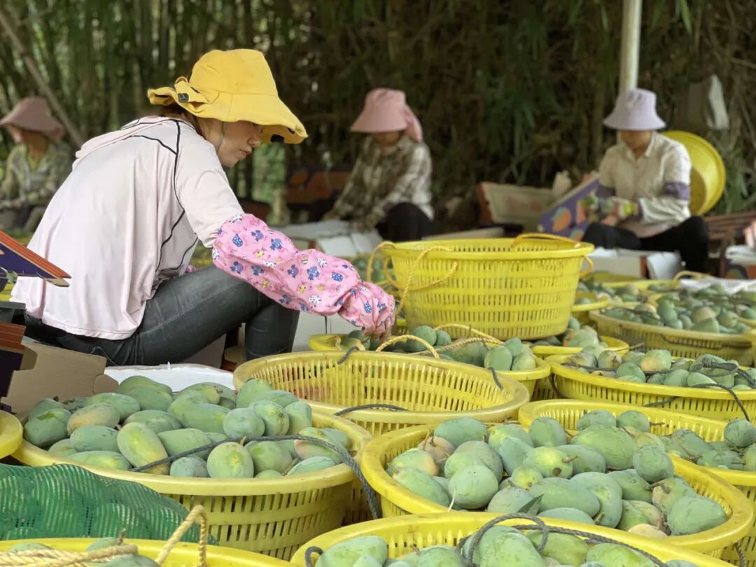 广西百色,一颗颗果型细长、呈S型的青色芒果,完成了摘果、分拣、包装、打包环节,通过新电商平台实现“桂果出乡”,助力乡村振兴。