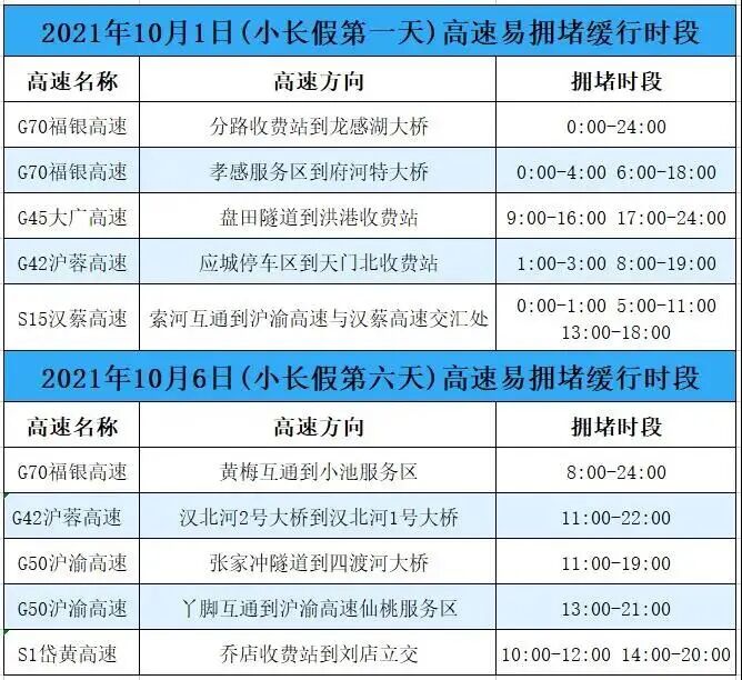 高速公路最拥堵路段主要包括:岱黄高速、关豹高速武汉段,汉蔡高速,沪蓉高速汉川段,沪渝高速鄂州、仙桃至荆州段,京港澳高速蔡甸段,二广高速襄阳、荆门段,福银高速云梦、十堰段等路段。出行线路选择方面,请驾驶员出行前通过手机导航APP查看实时路况,避开红色拥堵路段,预先熟悉分岔路口。