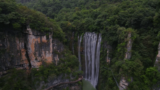 一对前来游玩的夫妇忍不住心中的情愫生出甜蜜的爱意在延绵的瀑布前十指紧扣真情告白