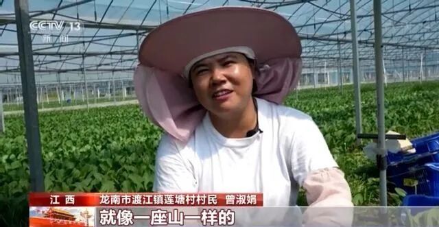 龙南市渡江镇莲塘村永丰蔬菜基地割菜员工曾淑娟:“国家在我心目中就像一座山一样吧。”