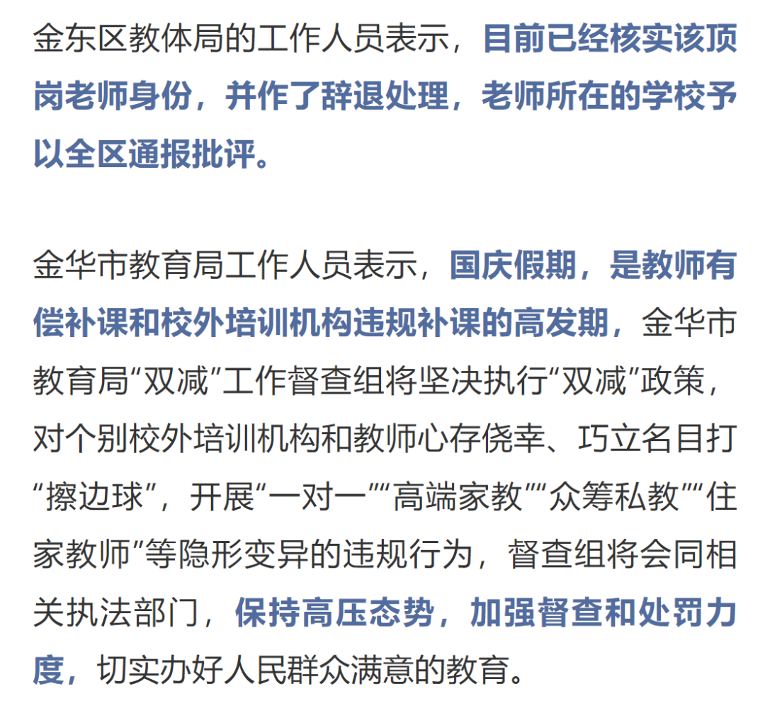 9月28日晚上,浙江省金华市教育局“双减”工作督查组、金东区教体局、公安等部门联合展开夜间突击检查。根据群众举报线索,检查组在当地傅村镇一间民房内发现,一名公办学校教师正在现场为3名学生进行补课。检查人员对该教师的行为现场进行了叫停。