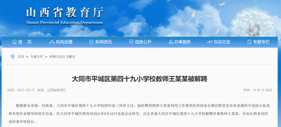 据山西省教育厅网站消息,根据群众举报,经核查,山西省大同市平城区第四十九小学校四年级三班班主任、临时聘用教师王某某利用工作便利在班级家长微信群里发布其亲属所开设的小饭桌和有偿作业辅导班招生信息。