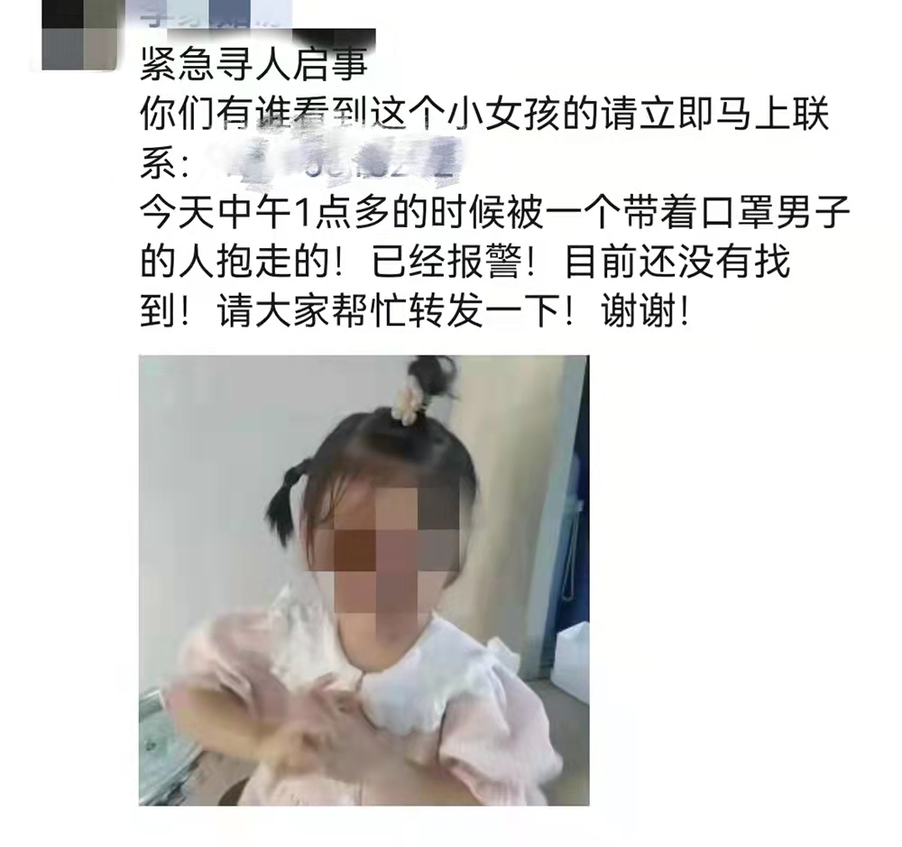 10月2日下午,湖南郴州市桂阳县一名3岁小女孩在街上玩耍时被一名戴口罩的陌生男子带走女孩母亲发现孩子丢失后迅速报警并在朋友圈发布寻人启事