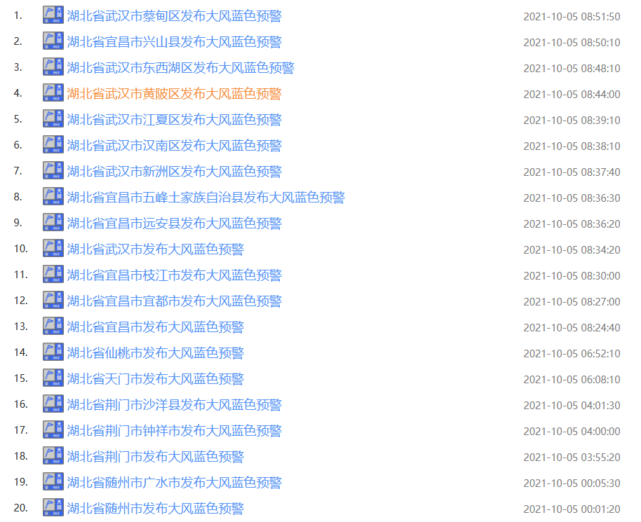 武汉市气象台2021年10月05日08时32分发布大风蓝色预警信号:预计今天我市大部地区将有4到5级偏北大风,江河湖面阵风可达6到8级,请注意防范。宜昌市气象台2021年10月05日08时23分发布大风蓝色预警信号:预计未来12小时,我市东部平原、沿江河谷和高海拔地区将有4-6级、阵风7-9级的偏北大风,请注意防范。仙桃市气象台2021年10月05日06时50分发布大风蓝色预警信号:预计今天,受冷空气影响,仙桃大部分乡镇将出现4到5级、阵风6到8级的偏北大风,请注意防范。天门市气象台2021年10月05日06时06分发布大风蓝色预警信号:预计今天,受冷空气影响,我市大部地区将出现4到5级,阵风6到8级的偏北大风,请注意防范。荆门市气象台2021年10月05日03时53分发布大风蓝色预警信号:预计未来12小时,东宝、掇刀、沙洋、钟祥大部乡镇及街道将有4-5级偏北大风,阵风6-8级,请注意防范。随州市气象台2021年10月04日23时59分发布大风蓝色预警信号:预计今晚到明天,受冷空气影响,我市大部地区将出现4到5级,阵风6到8级的偏北大风,请注意防范。【今明天冷空气带来湖北省降温】4日晚到6日,受冷空气影响,湖北省风力加大,偏北阵风可达5-7级,西部有分散性阵雨或雷阵雨,其他地区晴天到多云,大部地区气温下降。最高气温5日鄂西北17-21℃,鄂东31-34℃,其他地区23-27℃;6日鄂西北18-21℃,鄂东28-31℃,其他地区23-27℃。国庆长假最后一天(7日),鄂西仍有分散性阵雨或雷阵雨。提醒在外活动的朋友今天要注意防暑防晒,5-7日注意降温及鄂西阵雨天气。5日天气:鄂西北阴天有阵雨;鄂西南多云,局部有阵雨;其他地区晴天到多云。风:偏北风3到4级,阵风5到7级最高气温:鄂西北17~21℃;鄂东31~34℃;其他地区23~27℃最低气温:鄂西北15~18℃;其他地区18~21℃6日天气:鄂西北阴天有阵雨;鄂西南多云,局部有阵雨;其他地区晴天到多云。风:偏北风3到4级,阵风5到6级最高气温:鄂西北18~21℃;鄂东28~31℃;其他地区23~27℃最低气温:鄂西北14~17℃;其他地区17~21℃