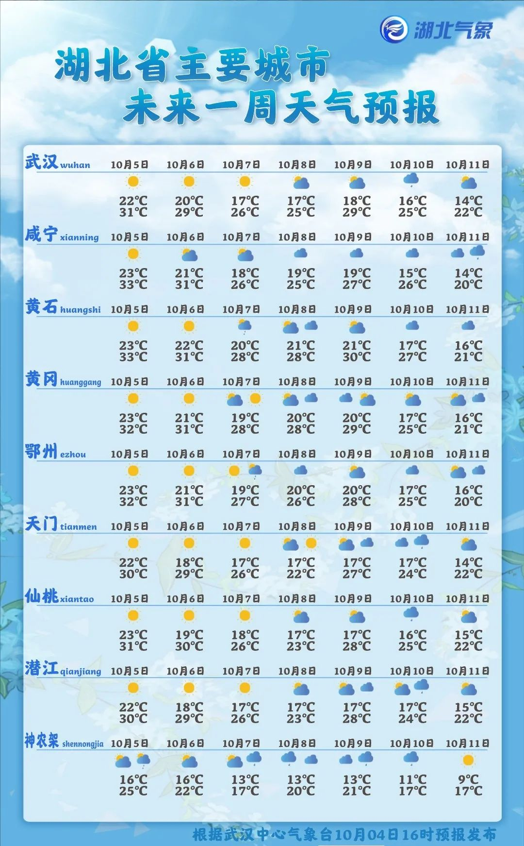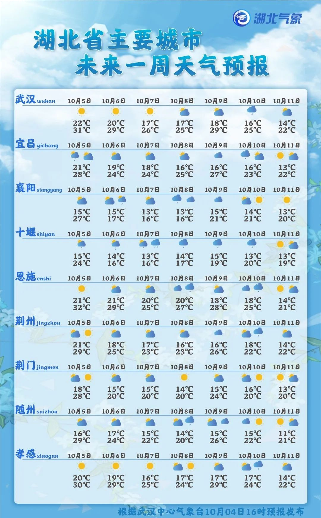 湖北省主要城市天气预报↓