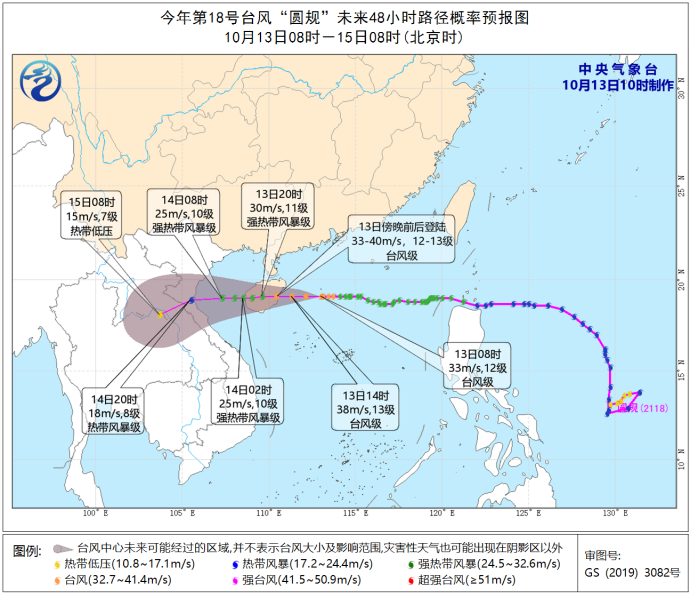 降水预报13日14时至14日14时,浙江东南部、福建东北部、台湾岛中部和南部、广东西南部、海南岛大部等地有大到暴雨,其中,浙江东南部、台湾岛东南部、福建东北部、广东中西部沿海、海南岛中南部等地的部分地区有大暴雨,台湾岛东南部局地有特大暴雨。