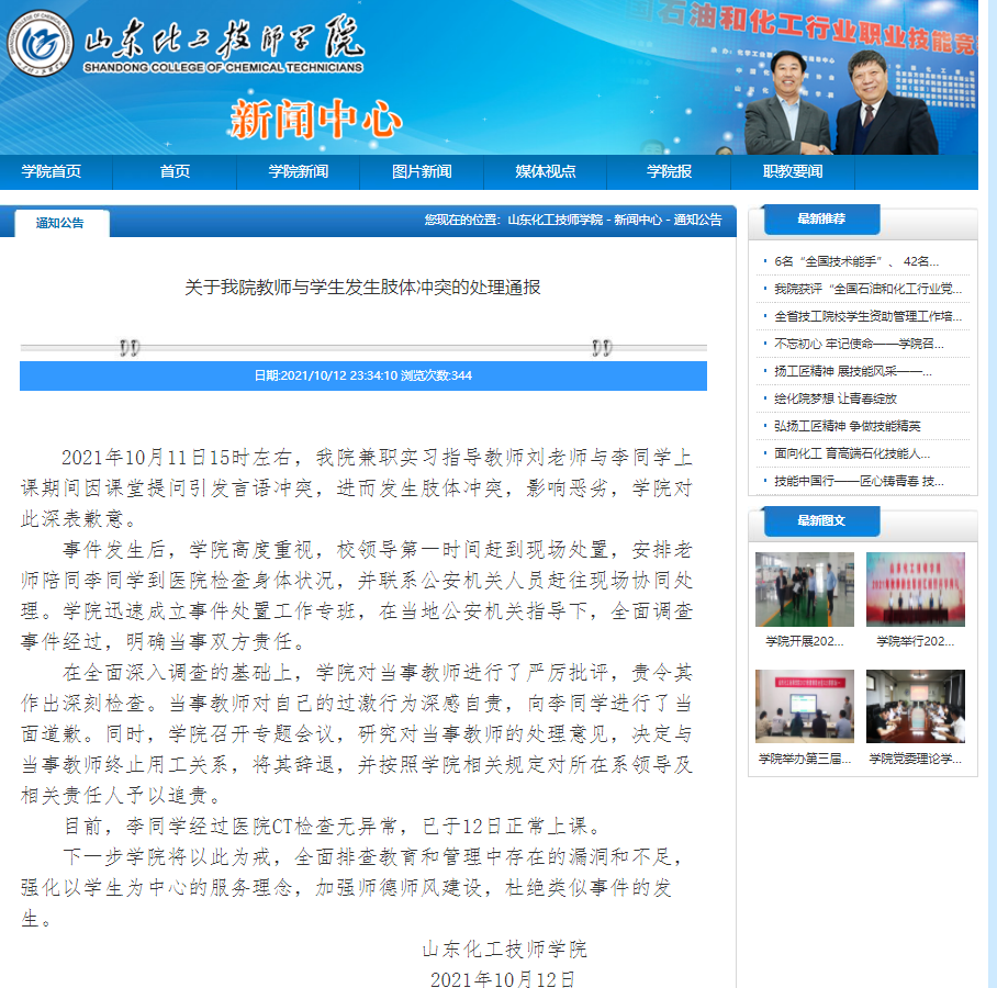 《通报》称:2021年10月11日15时左右,该校兼职实习指导教师刘老师与李同学上课期间因课堂提问引发言语冲突,进而发生肢体冲突。