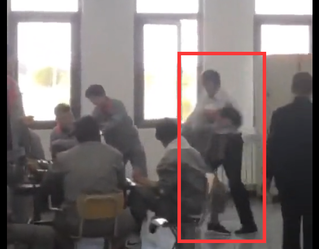 现场视频显示,教室里一名身穿白色衬衣的男子扯住一名男生的衣服,用手向男生的头部挥了一拳,又多次踢踹男生的腿部。随后,该男子一把将男生摔倒在地上,再次用脚对男生上半身进行踢踹,现场有多名学生围观。有网友称,此事发生在山东化工技师学院新校区。