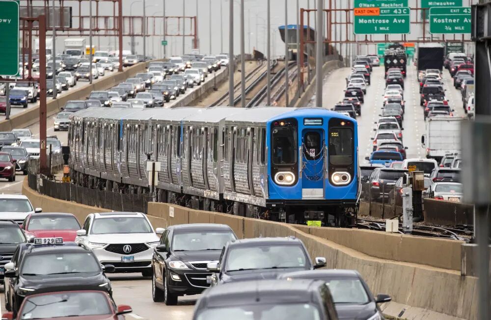 5月6日,在美国芝加哥,一列挂有7000系列车厢的地铁列车载客试运行。中国中车青岛四方机车车辆股份有限公司(中车四方)在美国制造组装的7000系列地铁车厢4月21日在芝加哥开始载客试运行。新华社发(乔尔·莱纳 摄)