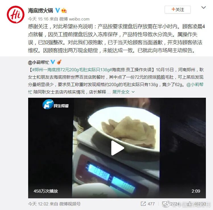 海底捞毛肚缺斤少两的事情被曝光后,很快引发热议。