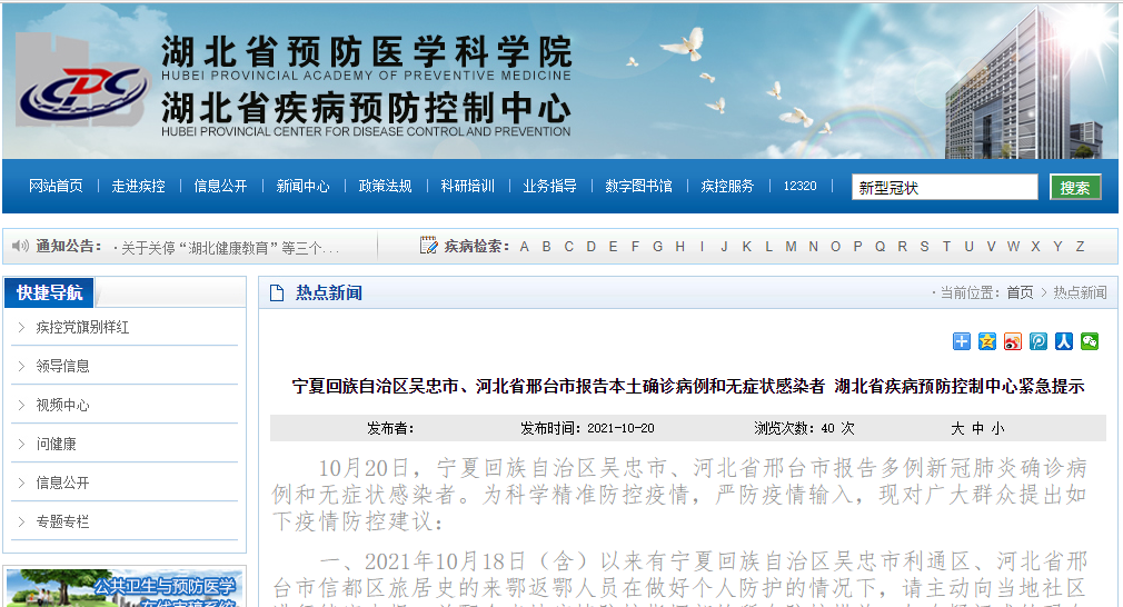10月20日,宁夏回族自治区吴忠市、河北省邢台市报告多例新冠肺炎确诊病例和无症状感染者。为科学精准防控疫情,严防疫情输入,现对广大群众提出如下疫情防控建议:一、2021年10月18日(含)以来有宁夏回族自治区吴忠市利通区、河北省邢台市信都区旅居史的来鄂返鄂人员在做好个人防护的情况下,请主动向当地社区进行健康申报,并配合当地疫情防控指挥部的所有防控措施。如有疑问或转码有误可拨打我省各级疾控中心咨询热线(号码附后)。二、鉴于当前的疫情形势,如无必须,建议近期不要前往宁夏回族自治区吴忠市、河北省邢台市。三、从宁夏回族自治区吴忠市、河北省邢台市的来鄂返鄂的人员,请提前了解我省当地防控要求;来鄂返鄂途中,请做好个人防护;来鄂返鄂后,应主动配合我省相关防控措施。四、广大群众要继续时刻保持良好的个人防护意识,养成随身携带口罩,科学规范佩戴口罩(尤其是在乘坐公共交通工具和在公共场所活动时)、勤洗手、常通风、保持安全社交距离的卫生习惯;不扎堆、不聚会,倡导健康生活方式。五、如出现发热、咳嗽、腹泻、乏力等症状,要佩戴一次性医用口罩及以上级别口罩,及时到就近的发热门诊进行排查和诊疗,就医过程尽量避免乘坐公共交通工具。六、接种新冠疫苗是预防控制新冠肺炎传播的最经济、最有效、最方便的措施,更是每一位公民应尽的责任和义务,请符合新冠疫苗接种条件的群众积极主动参与新冠病毒疫苗接种,携手共筑全民免疫屏障。